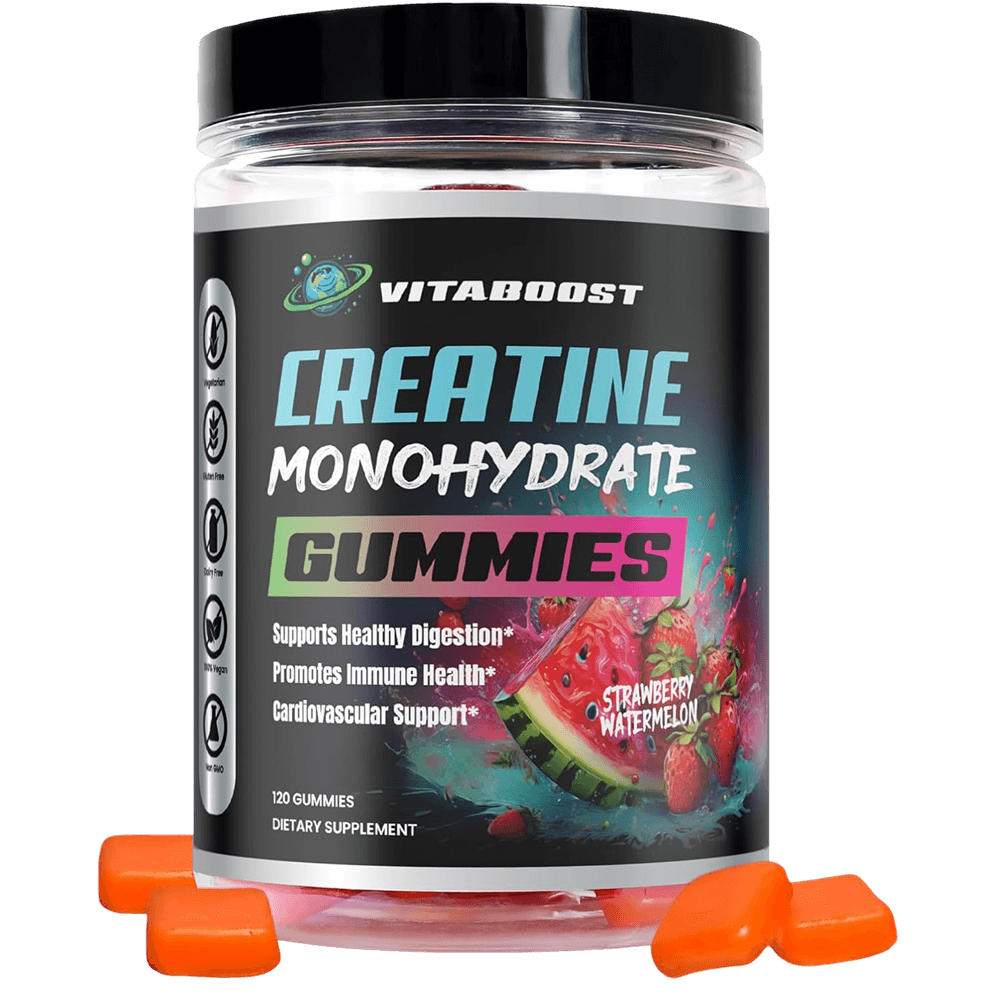 VitaBoost Creatine Gummies are a convenient and delicious way to fuel your muscle growth and boost your energy without the mess of powders. Each gummy delivers 5 g of pure creatine monohydrate...